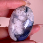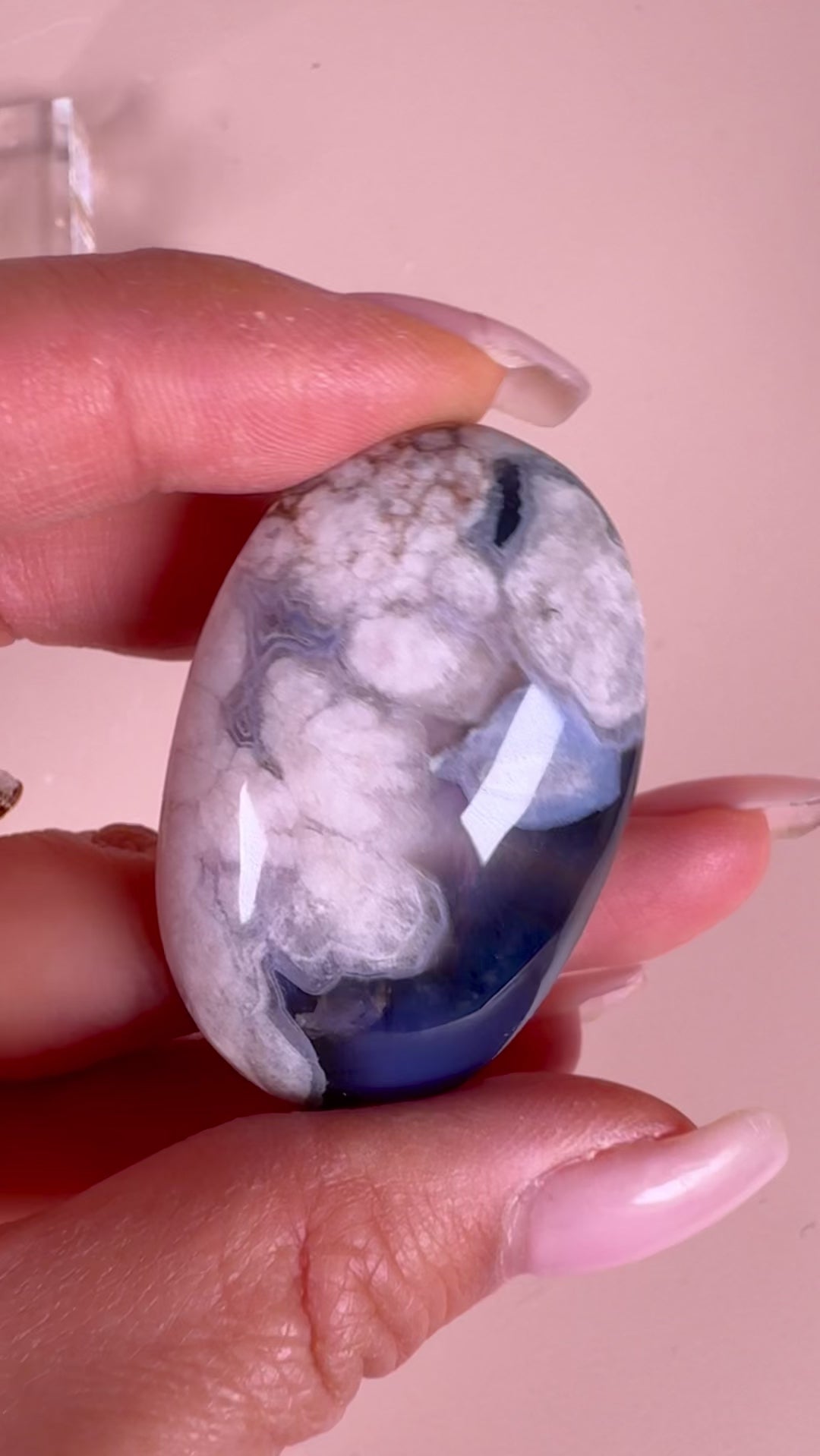 This Blue Flower Agate Palm carries a calming and uplifting energy that supports emotional growth and self-expression. It helps clear blockages in the Throat and Heart Chakras, encouraging open communication, inner peace, and the confidence to pursue your dreams. The floral patterns symbolize blooming potential, making it a powerful ally for manifesting intentions, soothing anxiety, and nurturing your inner voice.