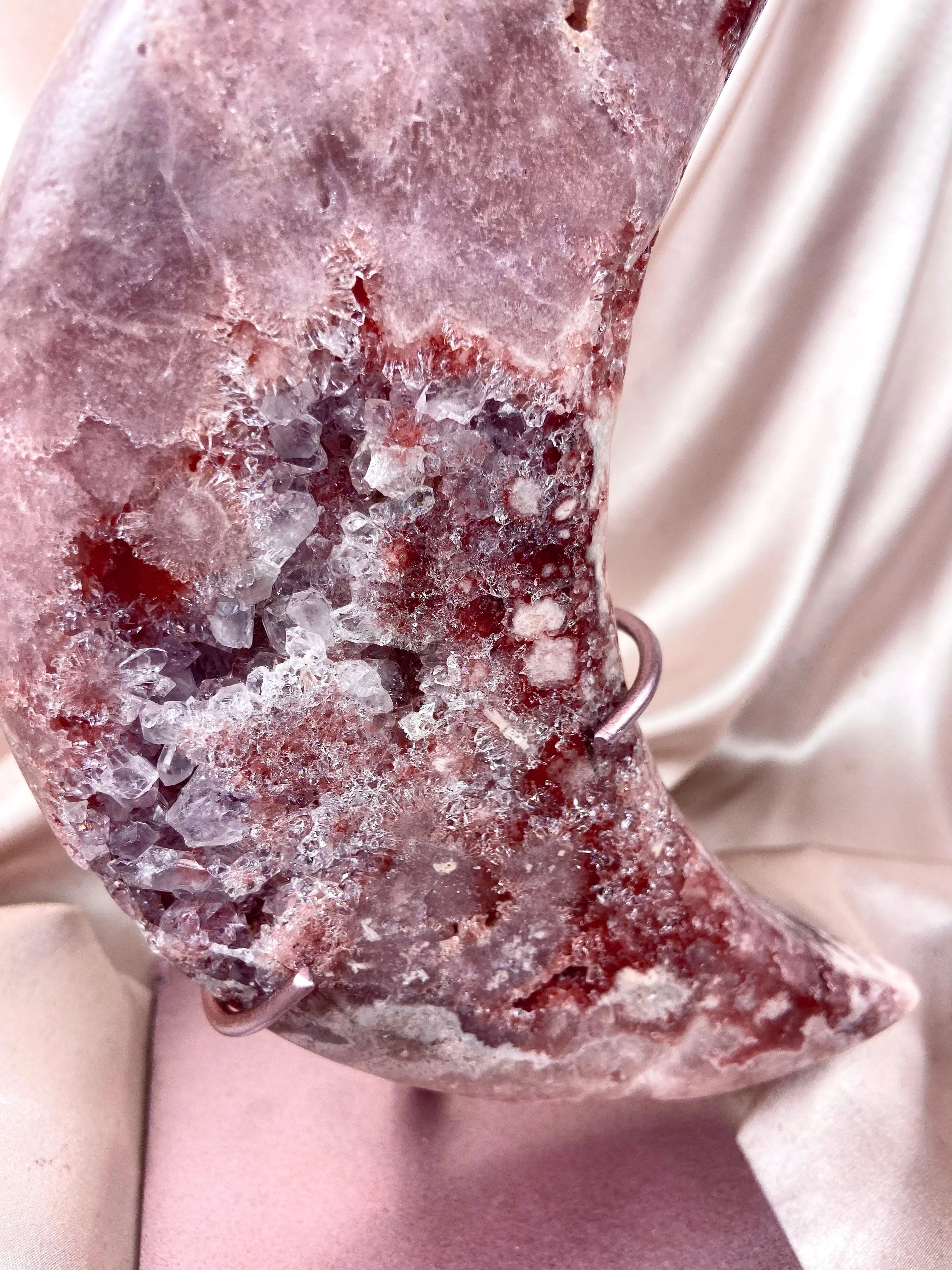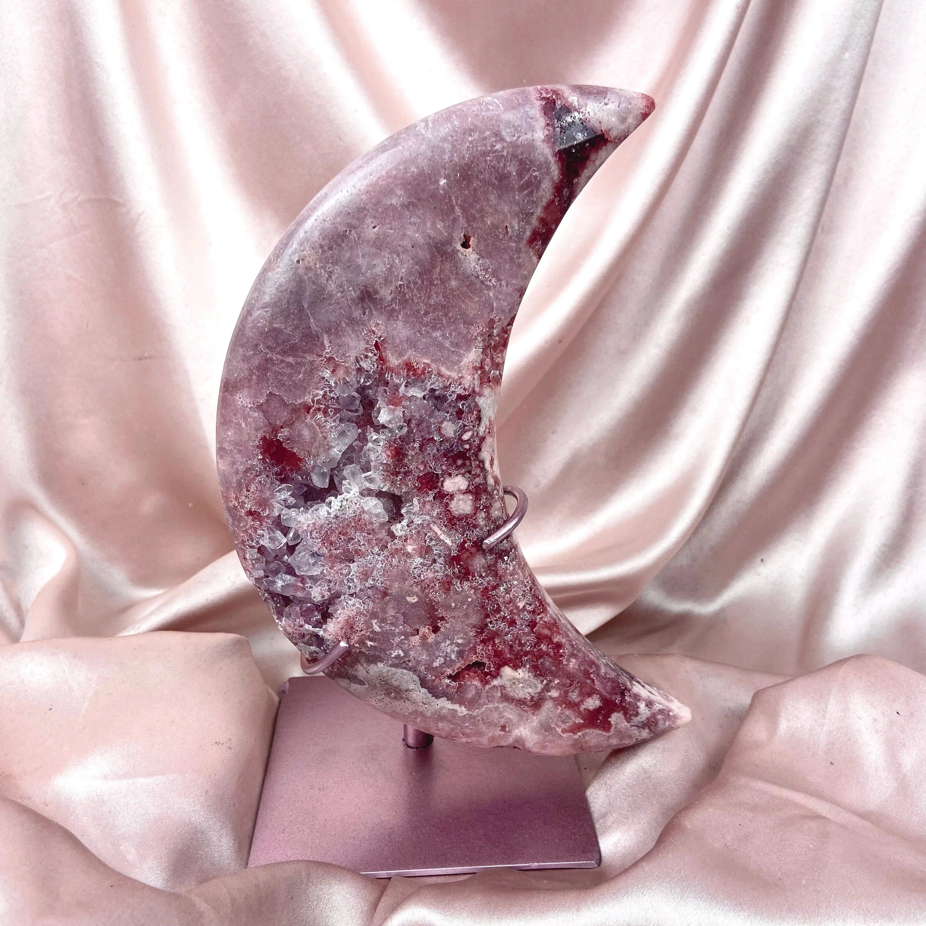 This listing is for (1) Ayla Pink Amethyst Moon with Stand: a captivating moon-shaped crystal known for its delicate pink hue. This piece serves as a beautiful decorative item and a potent tool for emotional and spiritual well-being.