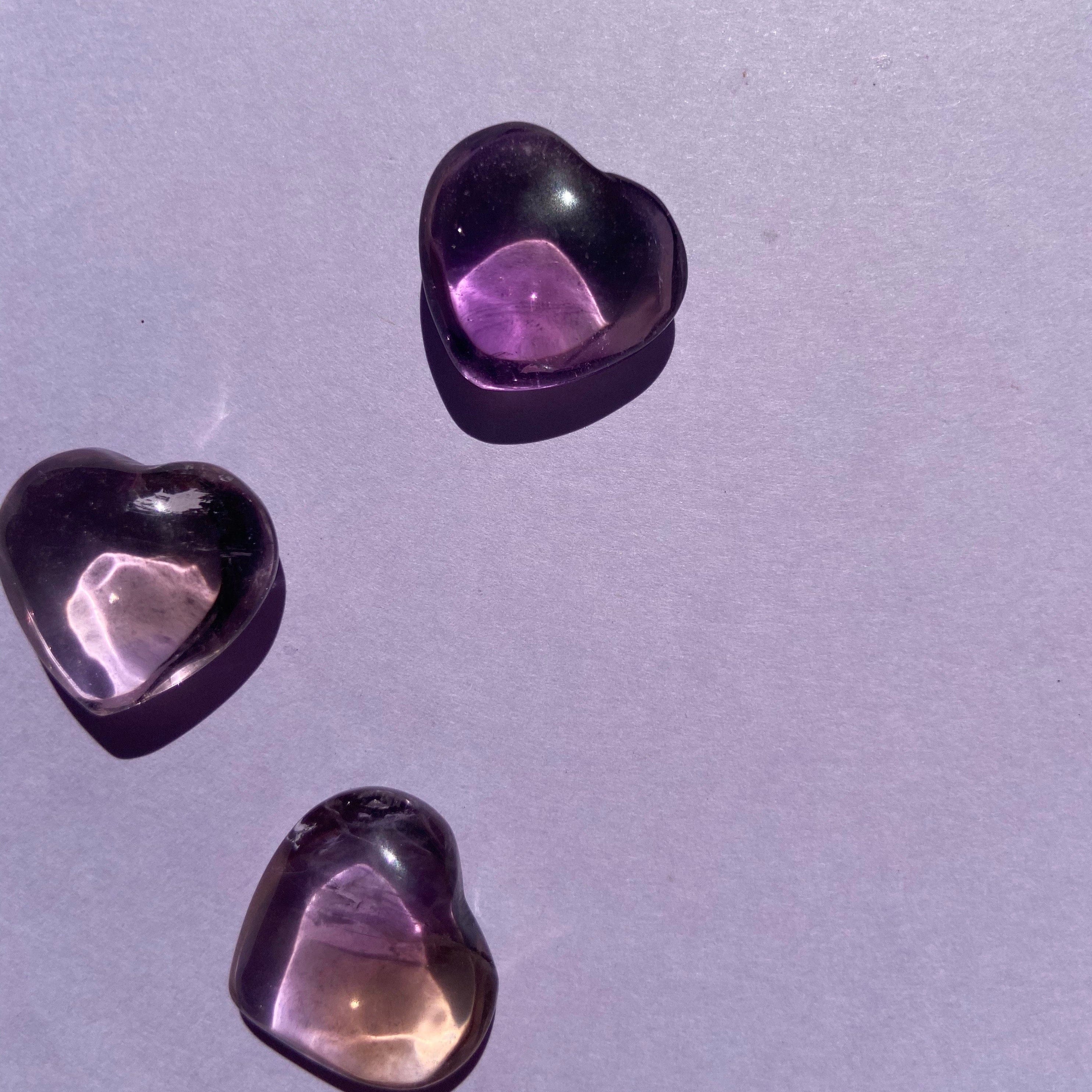 This listing is for (1) Ametrine Mini Heart: a captivating gemstone, born from the fusion of amethyst and citrine, offering a wealth of advantages. These mini hearts unite the tranquil energy of amethyst with the vibrant essence of citrine.