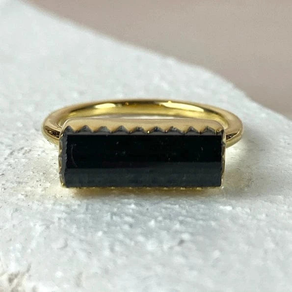 This listing is for (1) Black Tourmaline Gold Bar Ring: an elegant and protective piece of jewelry designed to harness the grounding and cleansing energies of Black Tourmaline. These beautiful rings feature 3 microns of gold plating over sterling silver, offering a blend of sophistication and powerful metaphysical benefits.