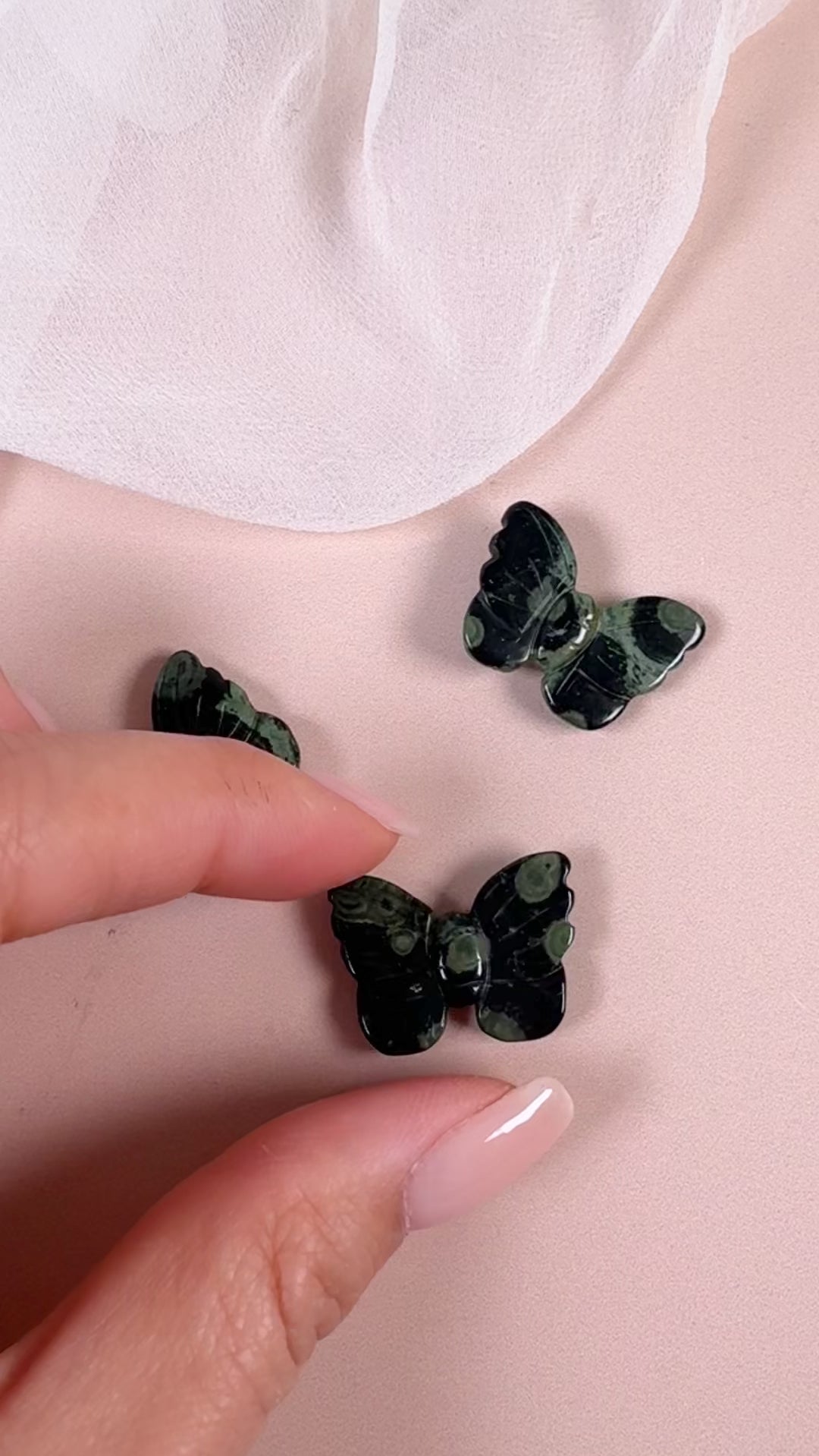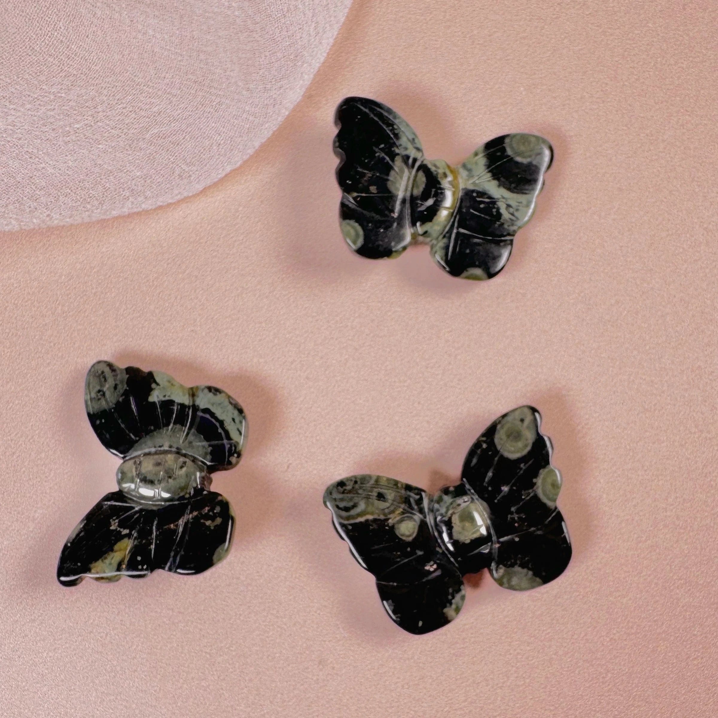This listing is for (1) Intuitively Chosen Kambaba Jasper Butterfly: a unique and captivating crystal tower, known for its deep green color and orbicular patterns, perfect for both decoration and harnessing its powerful healing properties.