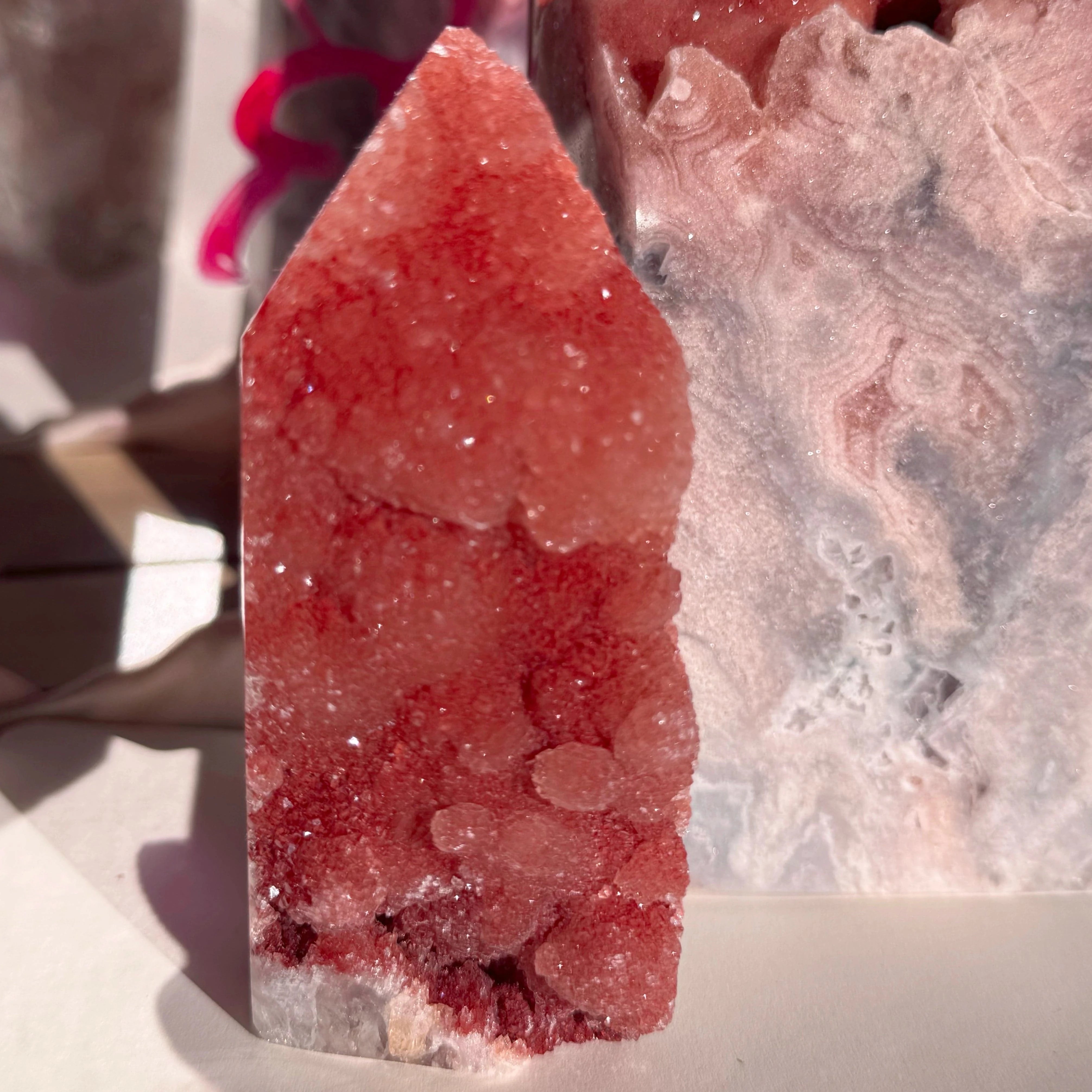 This Lipstick Red Pink Amethyst Tower is a captivating and rare variety of Quartz that exhibits a delicate pink hue, setting it apart from the traditional purple Amethyst. This tower serves as a beautiful decorative item and a potent tool for emotional and spiritual healing.