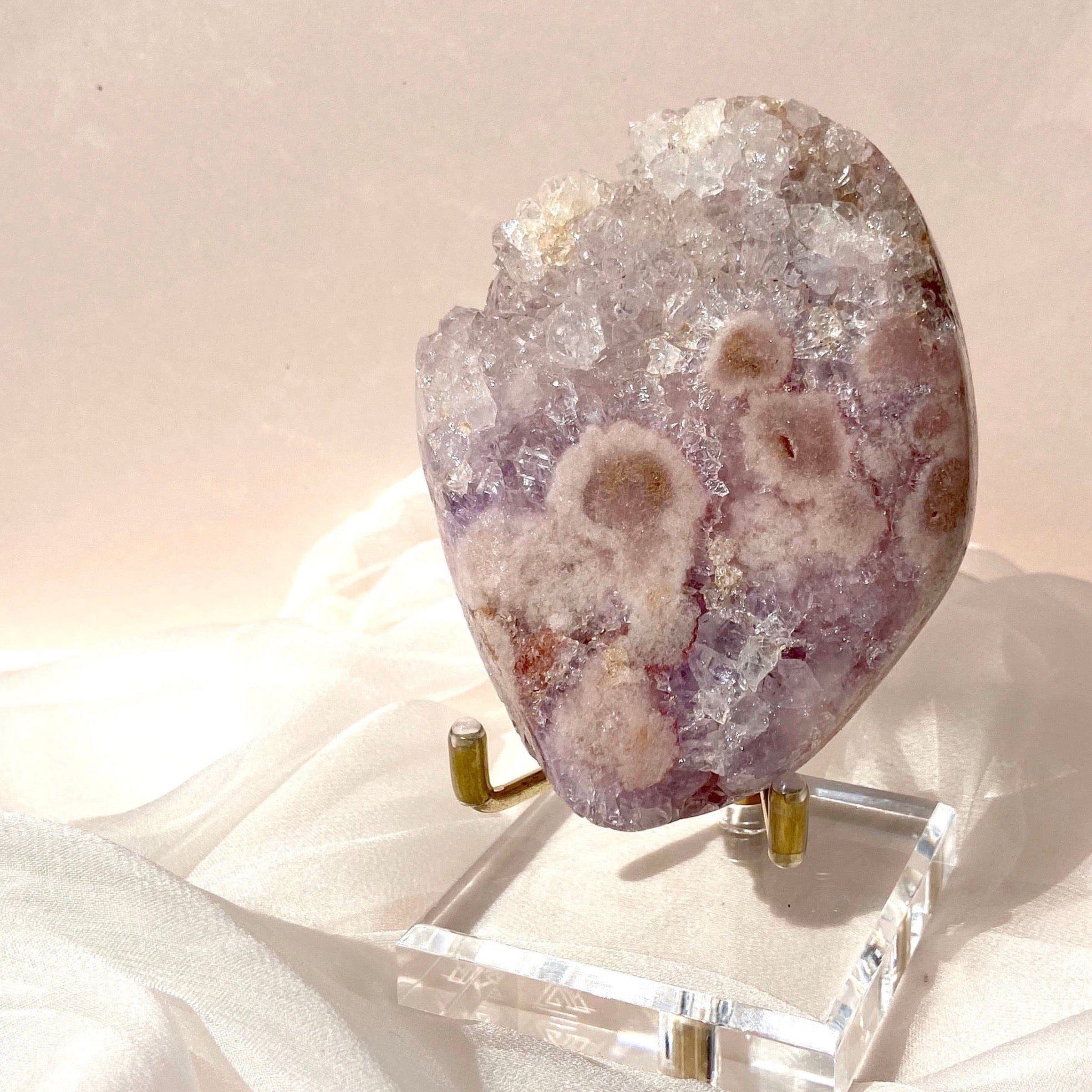 This listing is for (1) Pink Amethyst Freeform: an enchanting crystal known for its calming and loving energy. This specific piece showcases glassy quartzation, accentuated by a stunning interplay of pink flowery plumes and contrasting purple hues in the background, making it a perfect addition to any home decor.