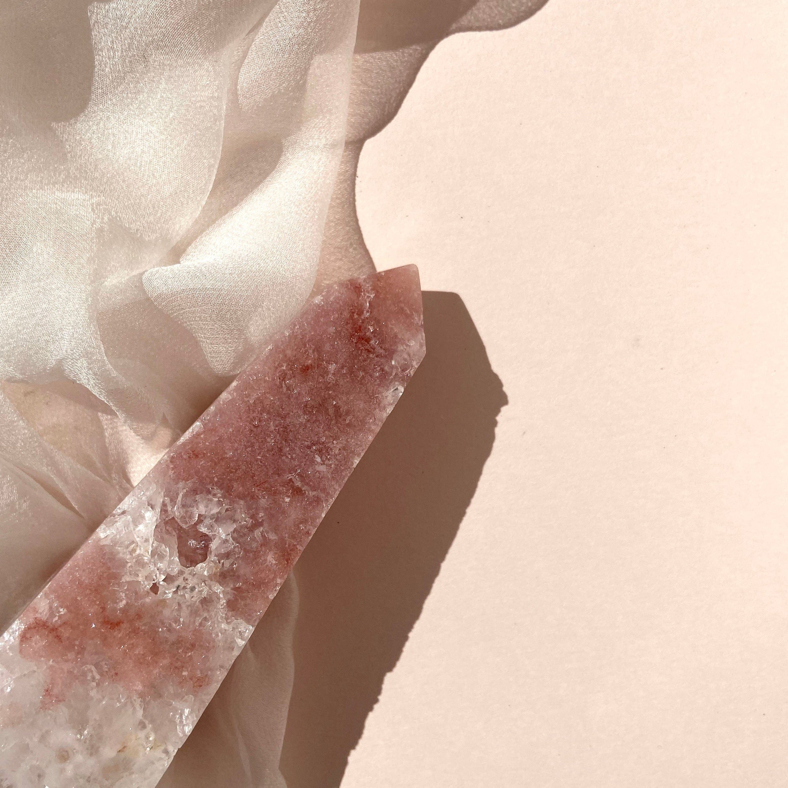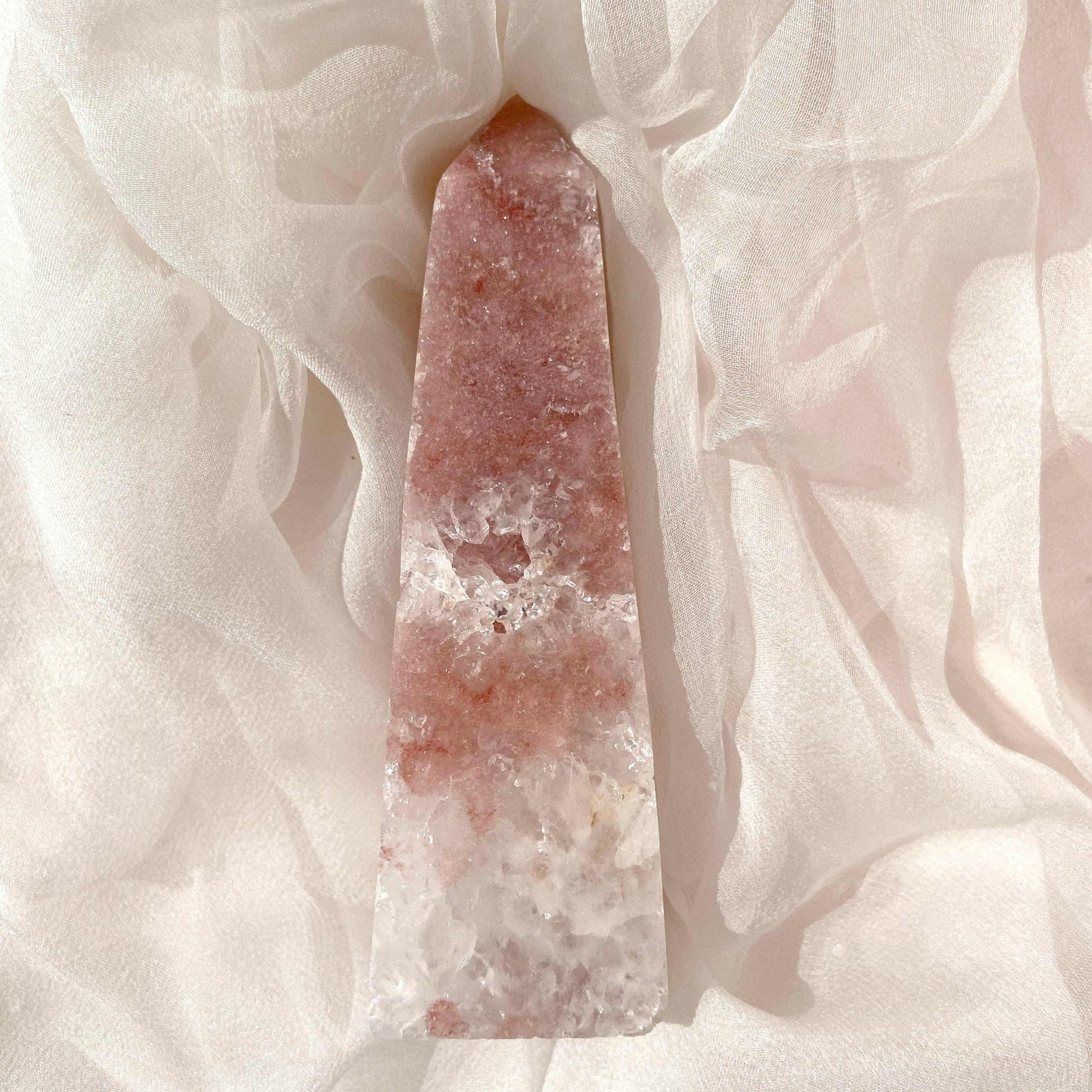 This listing is for (1) Pink Amethyst Tower: a stunning crystal tower that sparkles and shines from every angle. Captivating red veins add a touch of personality to its surface, featuring a small quartzy cave. The bottom half of the tower looks as if it was gently dipped in quartz, creating a unique and enchanting piece.