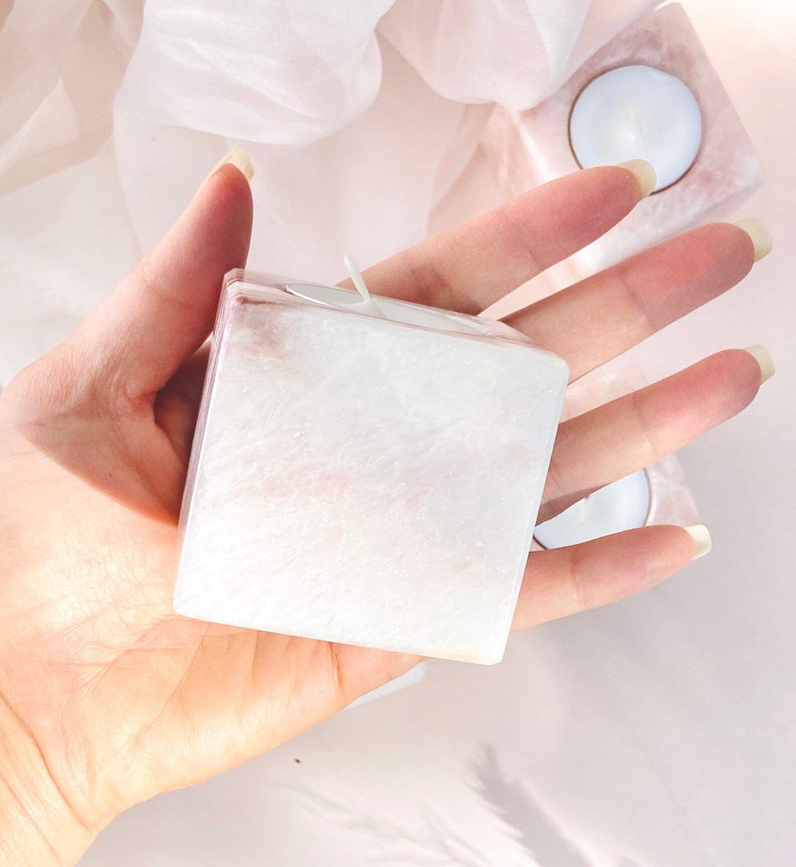 Pink Mangano Calcite: Known as a gentle and compassionate heart chakra stone. It helps address fears, lack of self-worth, and limiting beliefs, allowing you to shift into a space of unconditional love. Its loving energy soothes anxiety, trauma, tension, and stress. Placing the candle holder on your nightstand can help alleviate nightmares, promoting restful sleep.