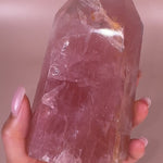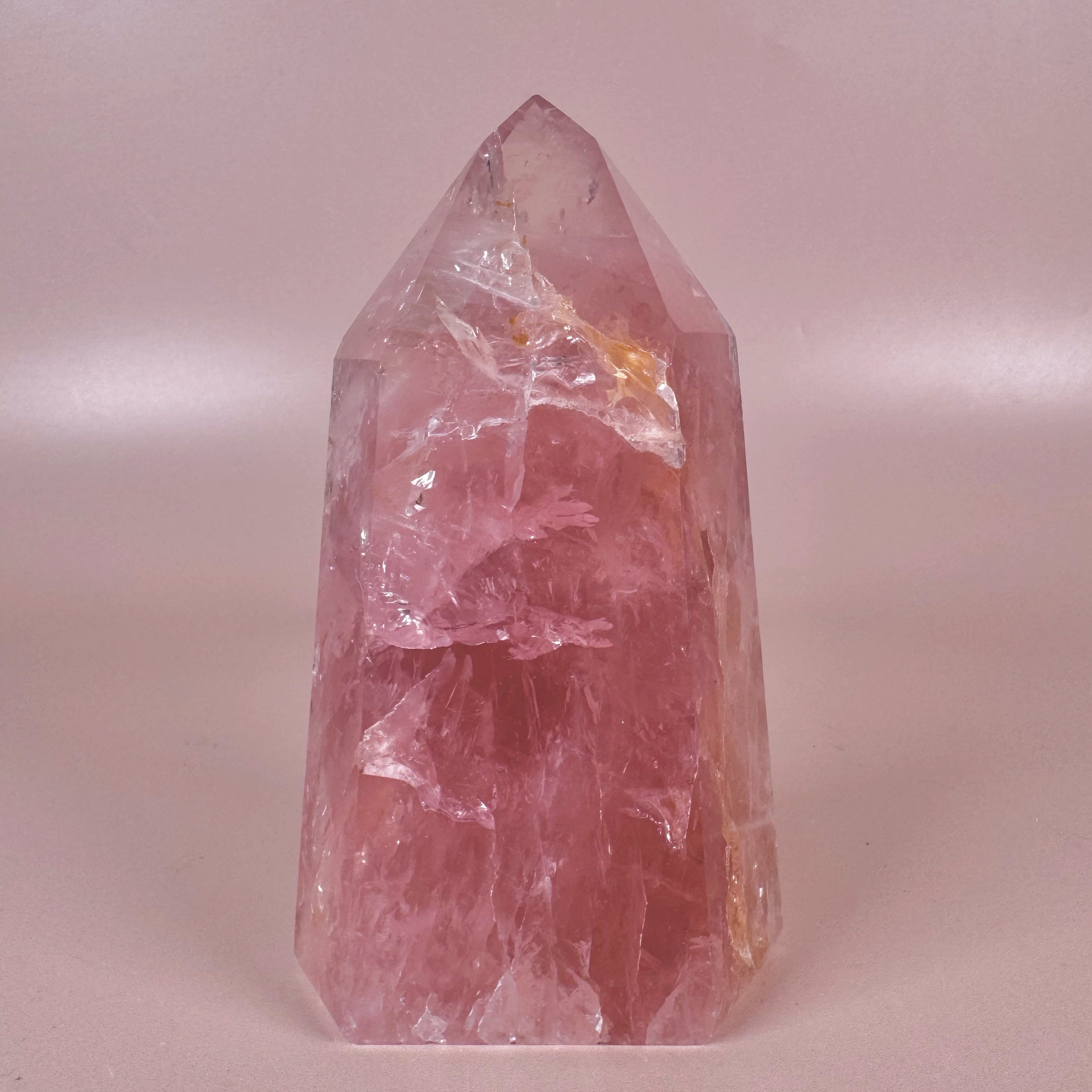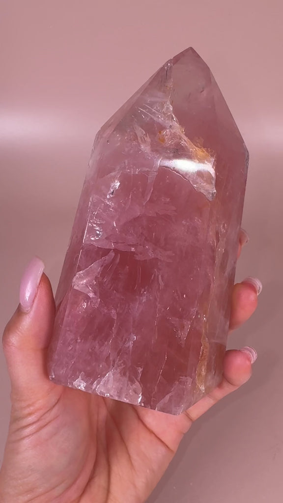 This Extra Quality Double Star Rose Quartz Sphere with Pyrite and Golden Healer Inclusions is a beautifully crafted piece showcasing the gentle pink hues of Rose Quartz. This tower is perfect for bringing a touch of love and tranquility into any space.