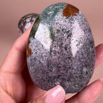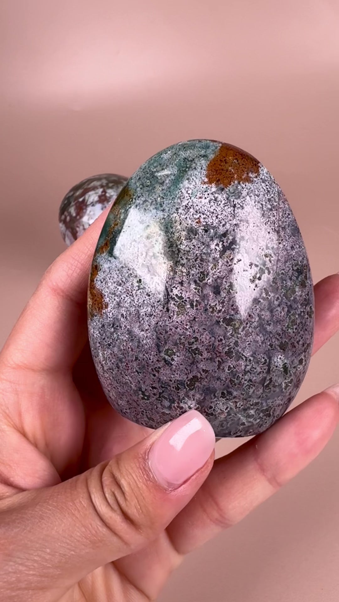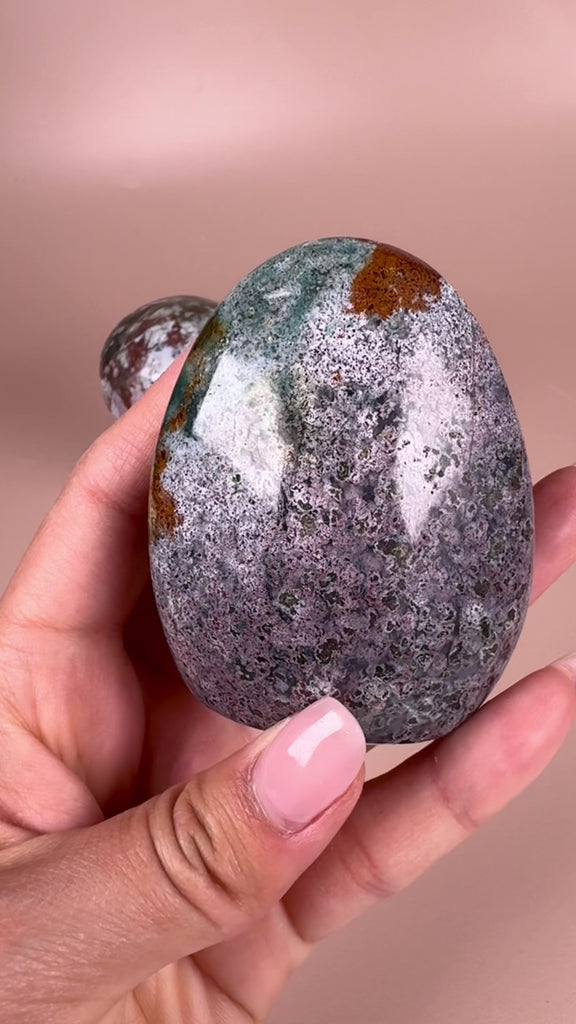 Ocean Jasper is celebrated for its ability to embody the nurturing energy of the ocean, offering soothing and calming effects. It is believed to promote relaxation, joy, and elevated spirits, helping to let go of stress and negativity. Pyrite inclusions add an extra layer of protection and grounding, enhancing the stone's overall healing properties.