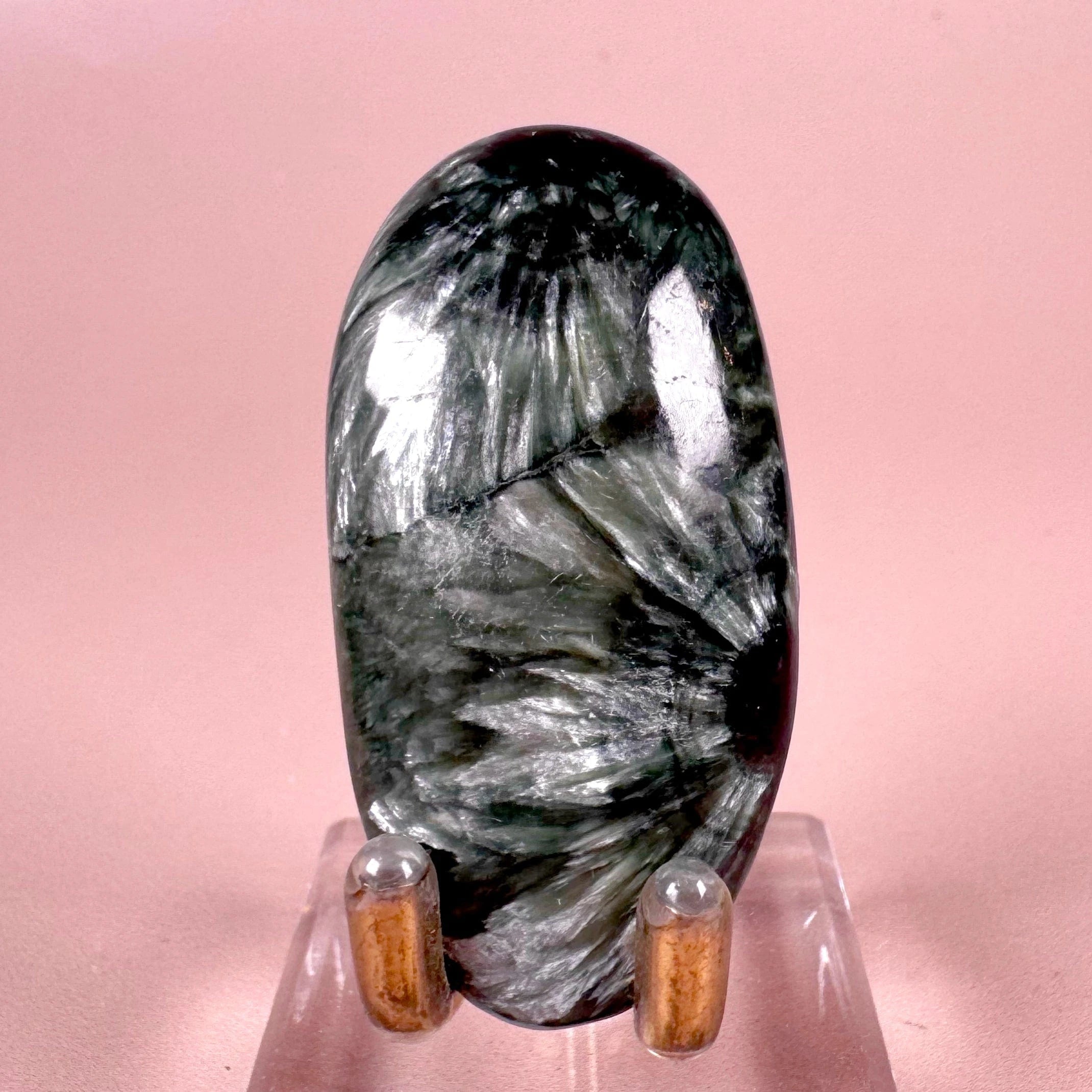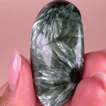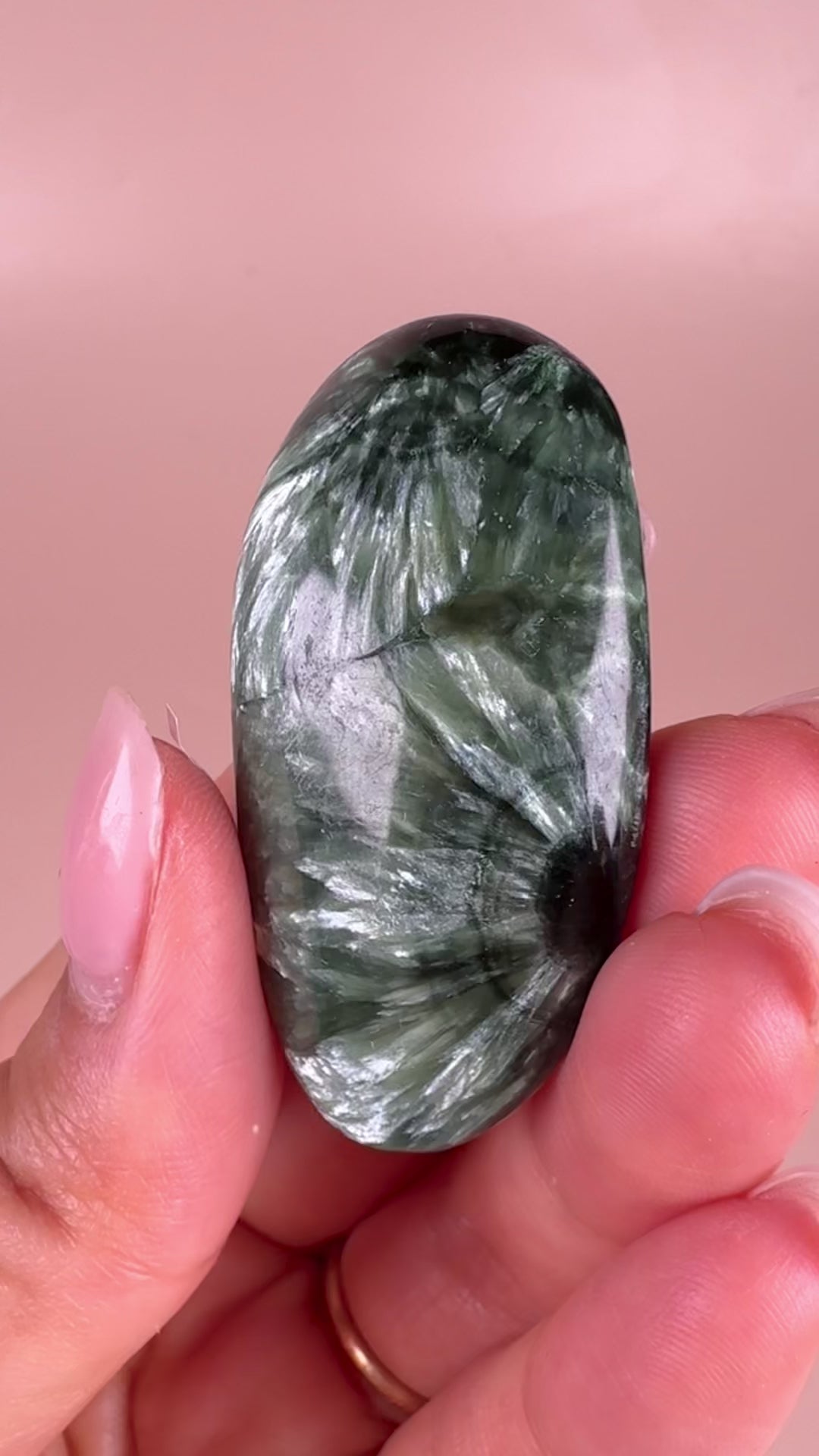 This polished Seraphinite palm stone is made to fit perfectly in your hand — a smooth, soothing companion for meditation, grounding, or simply carrying with you throughout the day. Its rounded shape makes it ideal for stress relief, helping you center your thoughts and calm your energy with each touch.