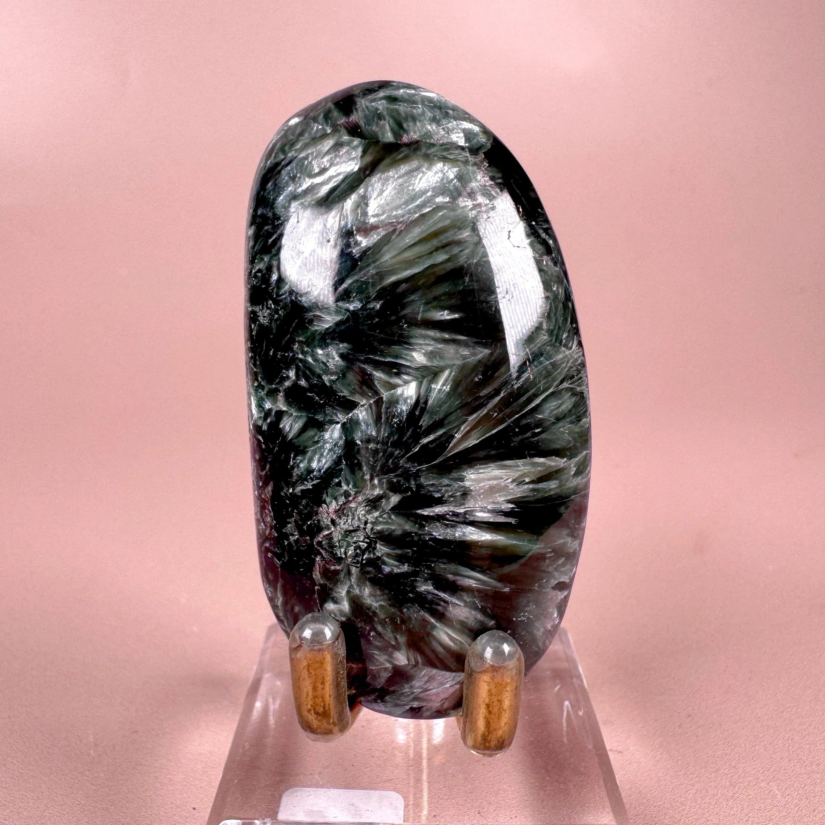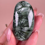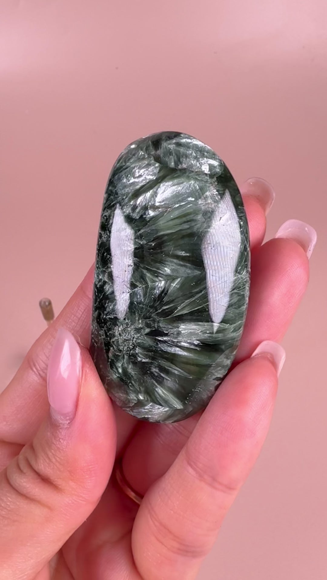 This polished Seraphinite palm stone is made to fit perfectly in your hand — a smooth, soothing companion for meditation, grounding, or simply carrying with you throughout the day. Its rounded shape makes it ideal for stress relief, helping you center your thoughts and calm your energy with each touch.