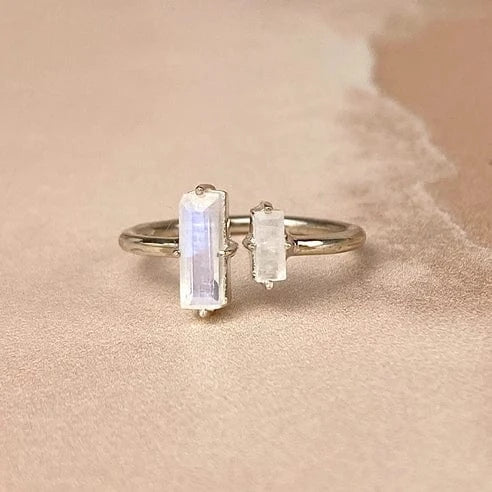 This listing is for (1) Silver Moonstone Duo Ring: a stunning piece that combines the calming and intuitive properties of Moonstone with the elegance of sterling silver. Moonstone is known as a stone of new beginnings, fostering inner growth and strength. It is particularly powerful for balancing emotions and enhancing feminine energies, making it an ideal companion for meditation and personal development.