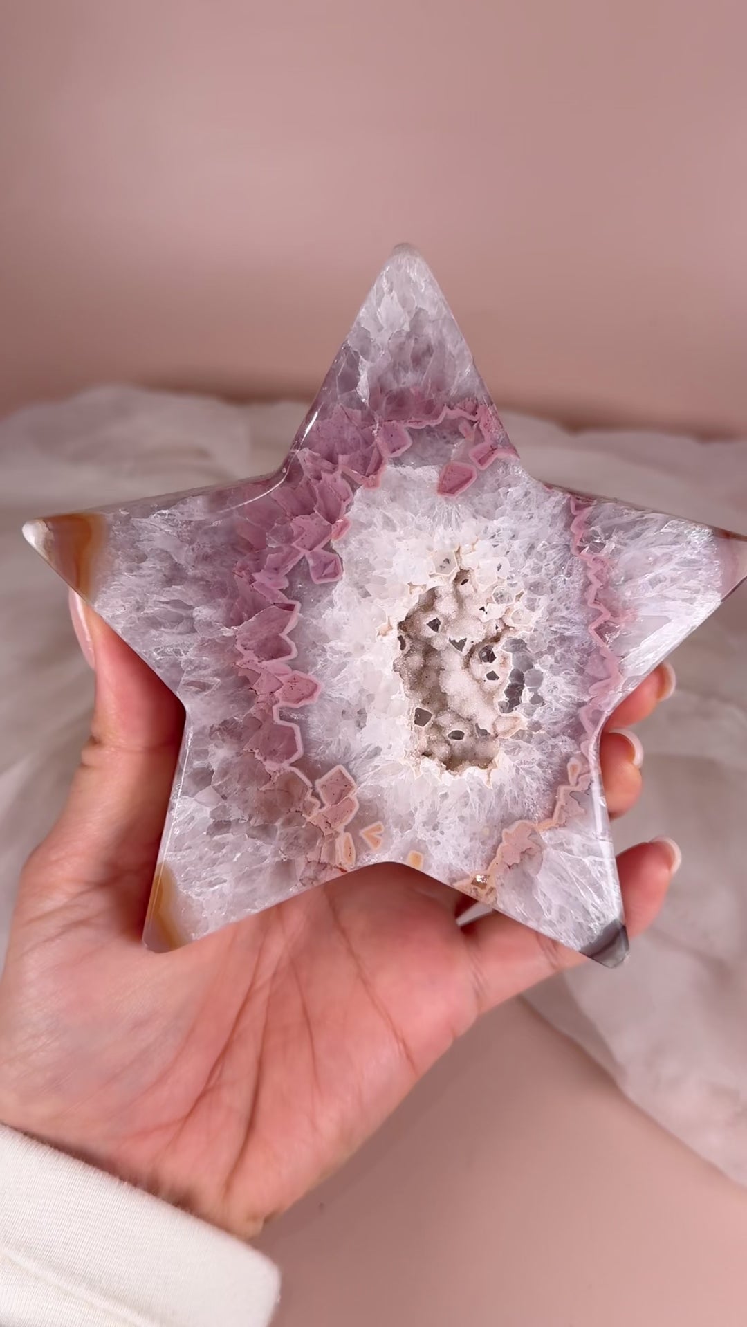 This Sugar Druzy Pink Agate Star is the exact piece you will receive. A beautifully crafted piece showcasing the natural beauty of agate. With its fine grain and vibrant, banded colors, this tower is a striking addition to any crystal collection.